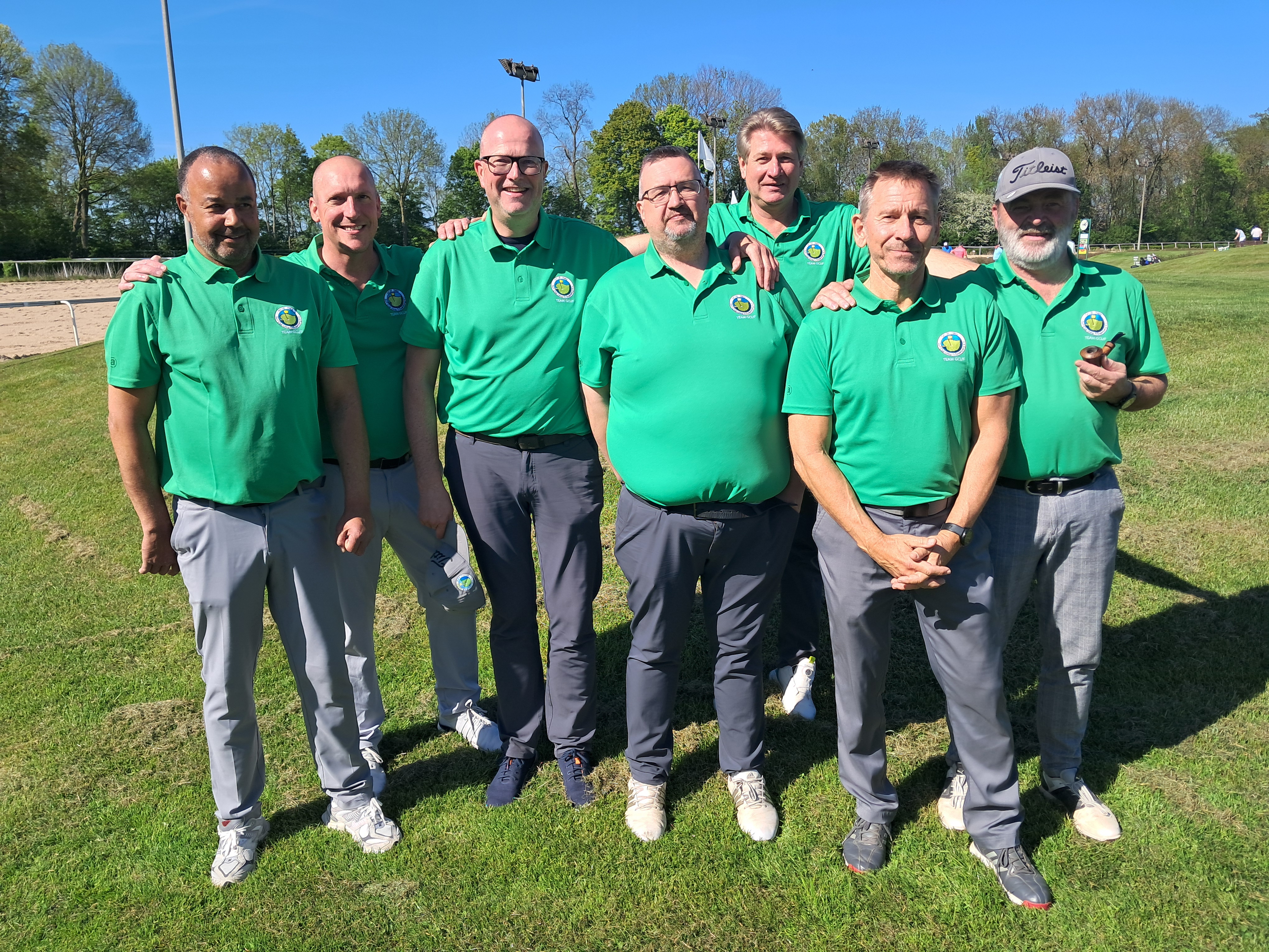 Als Saisonziel hat die 3. AK-50-Herren den Klassenerhalt ausgegeben und konnte mit dem zweiten Tagesplatz einen guten Grundstein hierfür legen. Auf dem relativ kurzen Platz bei den Golffreunden aus Dortmund konnte bei bestem Wetter, aber schlechten Grüns, bis auf den Schreiber dieser Zeilen (der Captain) insbesondere unser Neuzugang Bobbie Joe Brinkmann mit einer 76-er Runde überzeugen. Sehr gefreut hat uns die moralische Unterstützung von Frank (Pawelle) Pawelzik, der als Teil des Teams natürlich auch auf dem Mannschaftsbild zu sehen ist.